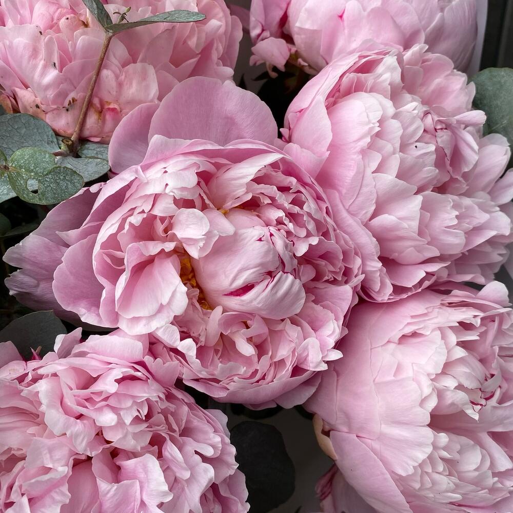 Лента атласная – 1 шт.Эвкалипт Синерия – 5 шт.Дизайнерская упаковка – 4 шт.пион «маргарет джерард» – 15 шт.