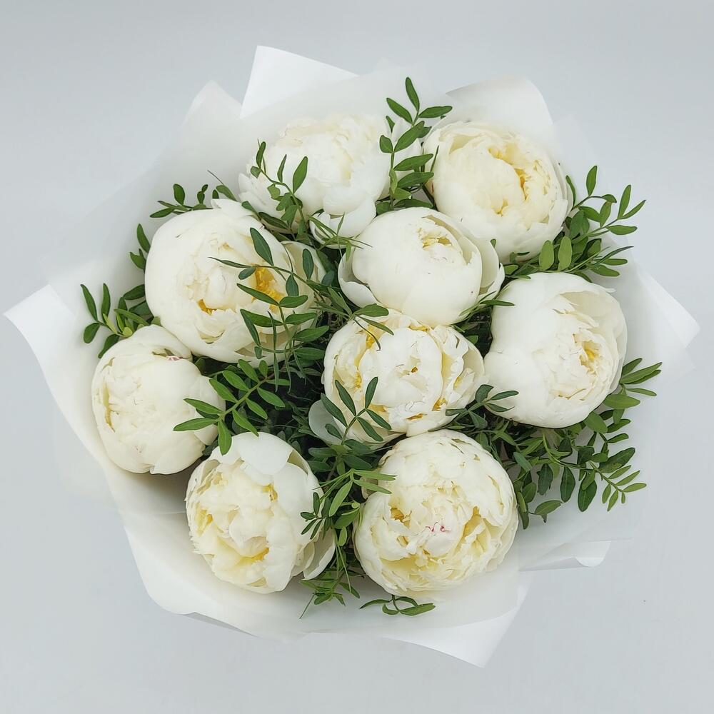 Зелень – 8 шт.Лента атласная – 1 шт.Пион премиум – 9 шт.Упаковка пленка матовая – 2 шт.
