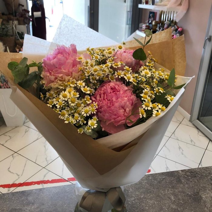 Пион – 3 шт.Матрикария (Ромашка Камила) – 5 шт.Эвкалипт – 1 шт.упаковка подарочная с лентой – 1 шт.Средство для продления жизни цветов – 1 шт.