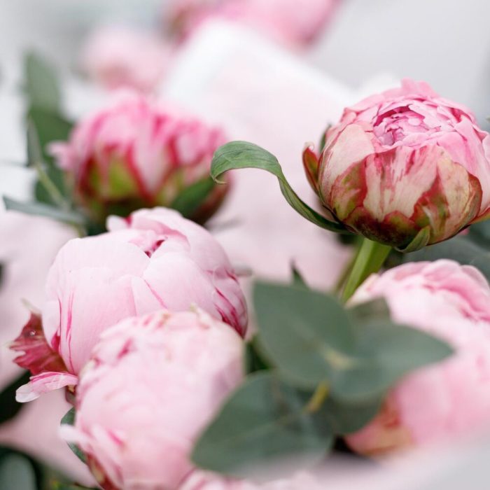 Эвкалипт – 5 шт.Лента атласная – 1 шт.Тишью – 1 шт.Пион Сара Бернар – 7 шт.Аквапак – 1 шт.Корейская пленка – 3 шт.