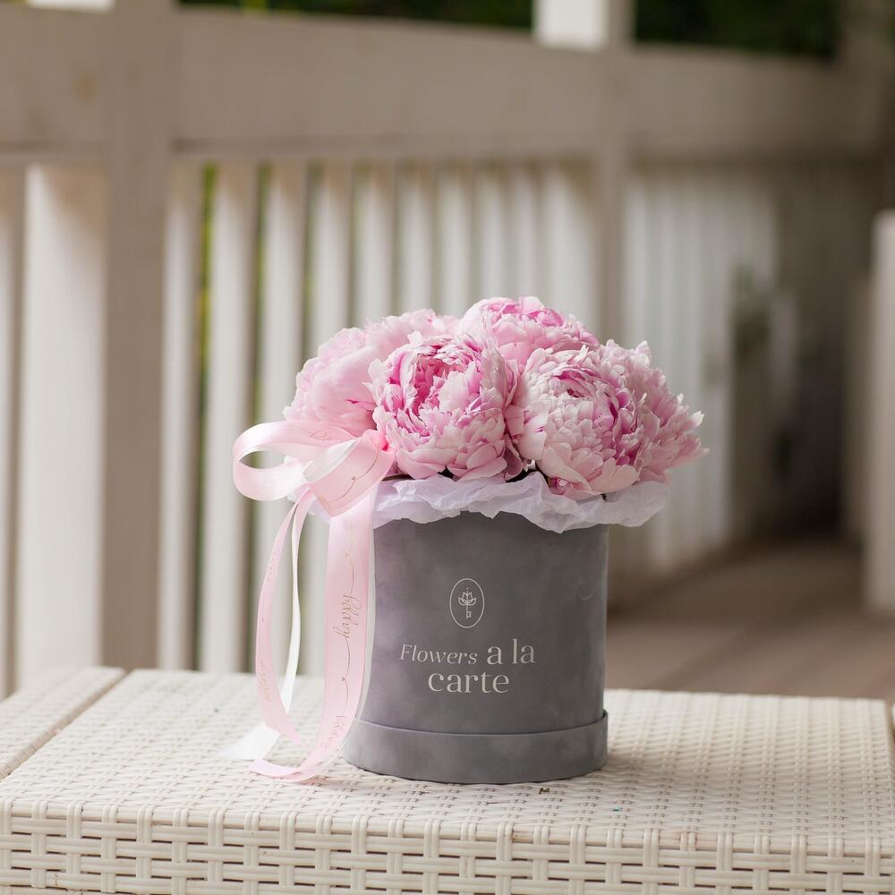 Лента атласная – 1 шт.Тишью – 1 шт.Бархатная коробка – 1 шт.Пион розовый – 7 шт.Оазис флористический – 1 шт.
