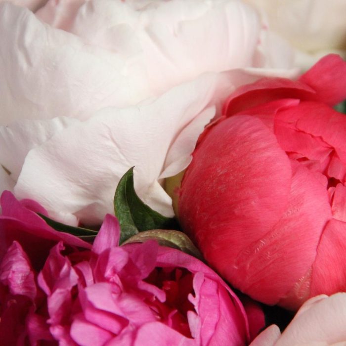 Моно букет из коралловых, белых и розовых пионов в лаконичной упаковке.Стильное цветочное решение для любого случая.