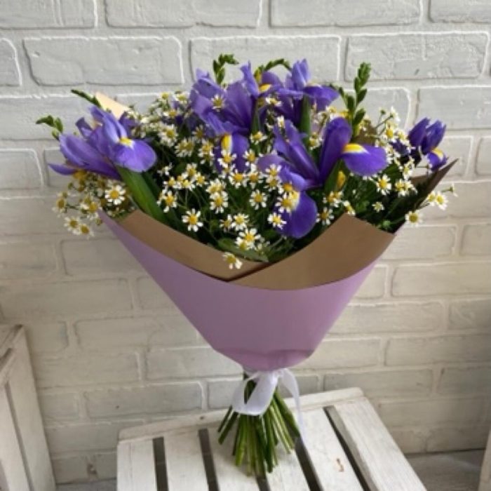 Ирисы фиолетовые – 9 шт.Фрезия желтая – 7 шт.Матрикария (Ромашка Камила) – 7 шт.
