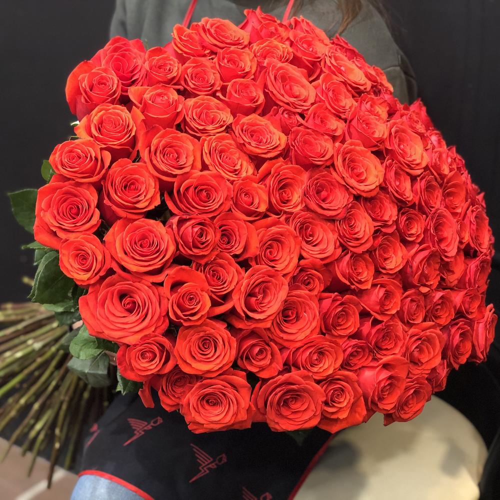 Красная роза эквадор – 101 шт.Пленка прозрачная – 1 шт.Лента атласная – 1 шт.