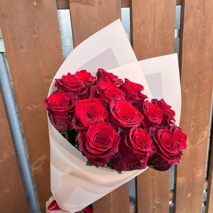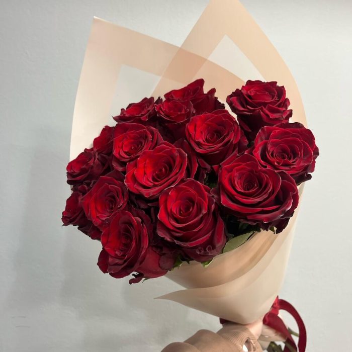 красная роза эквадор 60 см – 11 шт. Дизайнерская упаковка – 1 шт.