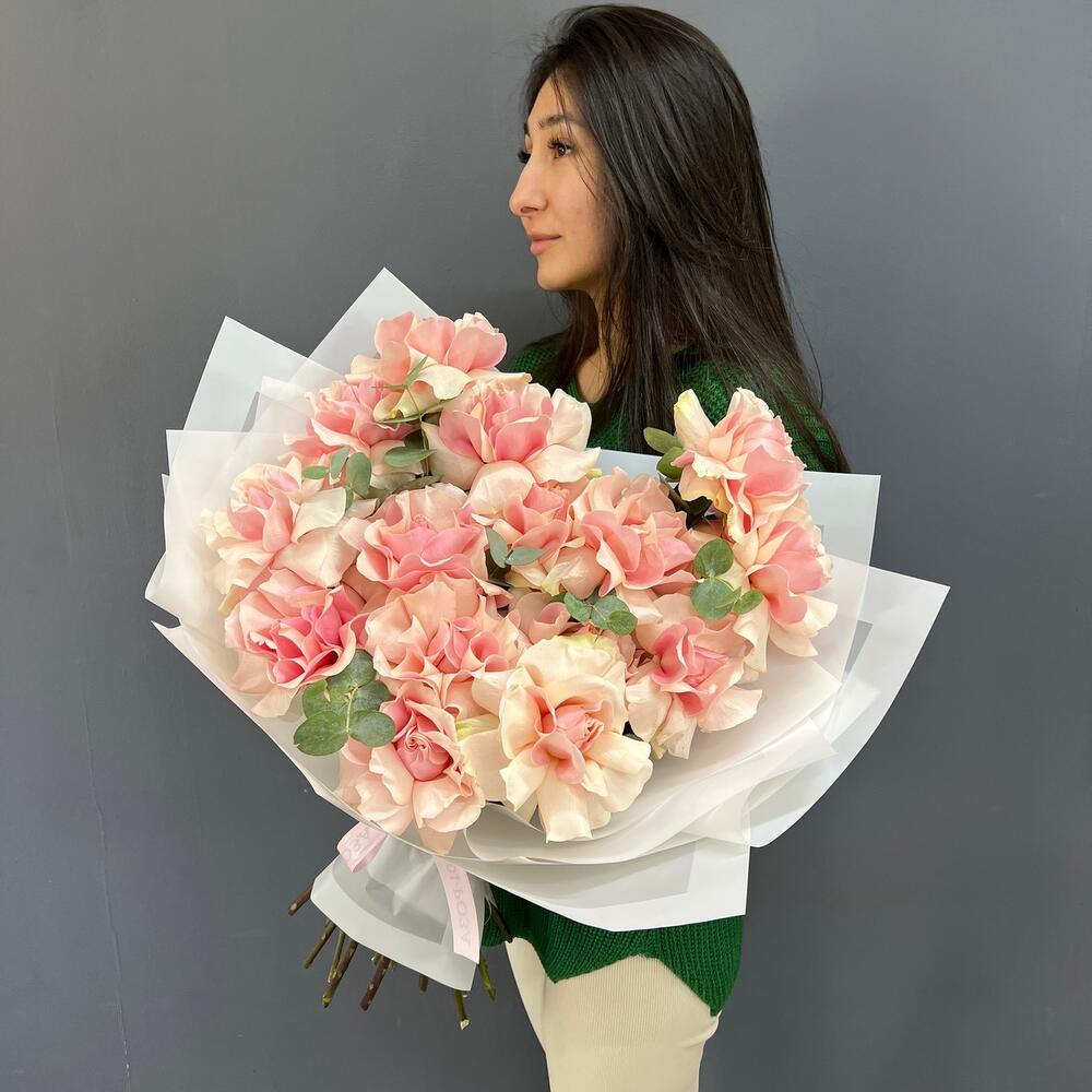 Эвкалипт – 7 шт.Атласная лента – 1 шт.Французская роза – 15 шт.Дизайнерская упаковка – 1 шт.
