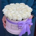 Лента атласная – 2 шт. Коробка шляпная – 1 шт. Роза голландия – 25 шт. Оазис флористический – 2 шт.