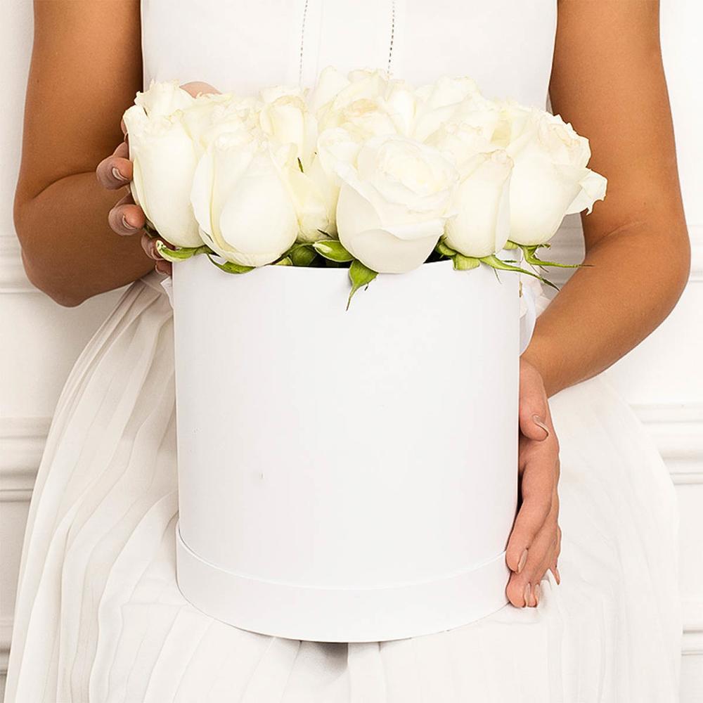 Роза белая – 25 шт.Коробка шляпная – 1 шт.Оазис флористический – 1 шт.