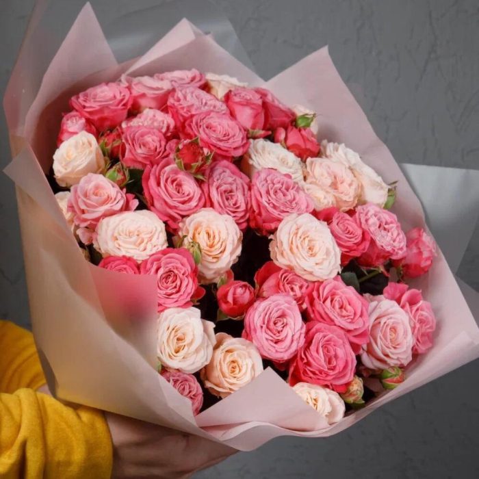 Микс пионовидных кустовых роз в дизайнерской упаковке
