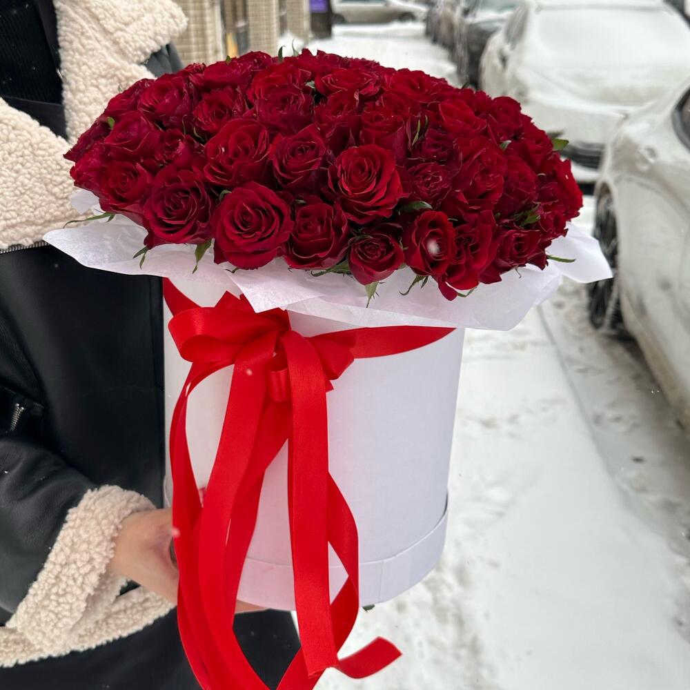 Роза красная – 45 шт.Лента атласная – 1 шт.Коробка шляпная – 1 шт.