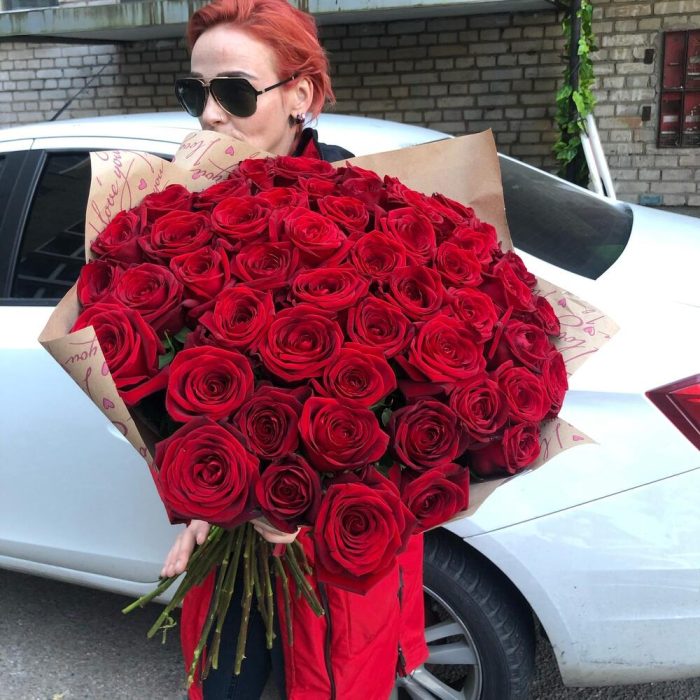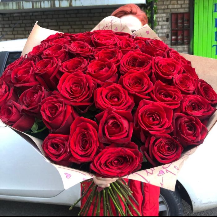 розы эквадор (60 см)красные – 51 шт.Крафт упаковка – 2 шт.Лента атласная – 1 шт.