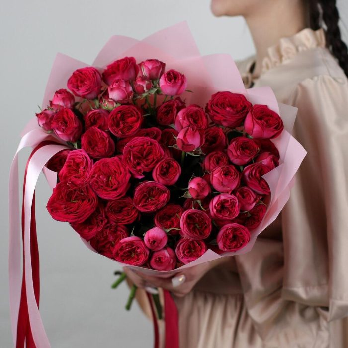 Лента атласная – 1 шт.Кустовая роза пионовидная – 9 шт.Матовая пленка – 3 шт.