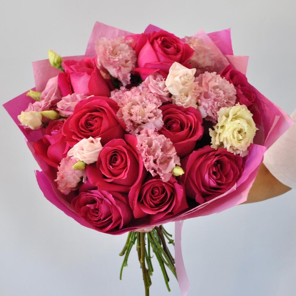 Лента атласная – 1 шт.эустома розовая махровая – 5 шт.роза Pink Floyd ароматная – 11 шт.упаковка жатая крафт бумага – 1 шт.