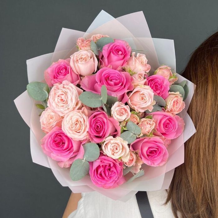 Роза кустовая пионовидная – 7 шт.Роза одноголовая – 9 шт.Эвкалипт – 5 шт.бумага дизайнерская – 6 шт.Лента атласная – 1 шт.