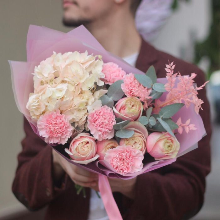 Писташ – 4 шт.Эвкалипт – 2 шт.Лента атласная – 1 шт.Роза пионовидная – 5 шт.Упаковка дизайнерская – 4 шт.Гортензия розовая – 1 шт.Диантус розовый – 5 шт.рускус стабилизированный – 1 шт.
