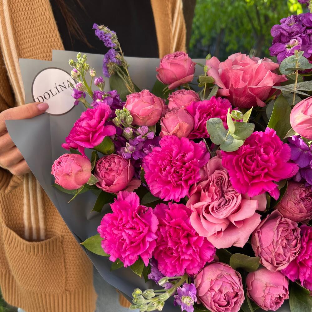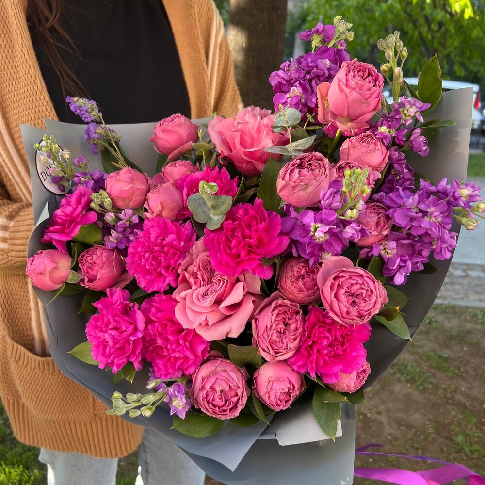 Маттиола – 7 шт.Роза пионовидная – 2 шт.Гвоздика – 8 шт.Роза кустовая – 3 шт.Эвкалипт – 2 шт.уракрвка дизайнерская – 1 шт.Зелень – 1 шт.