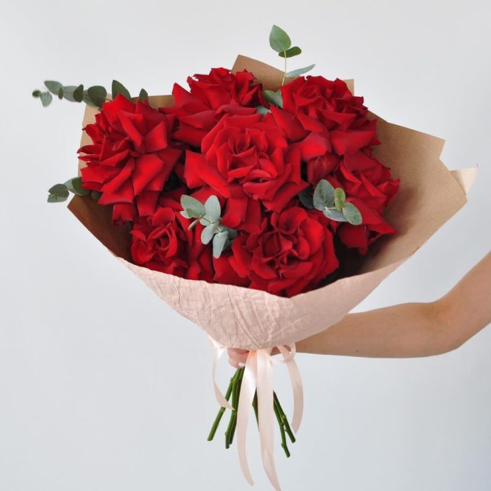 Эвкалипт – 1 шт.Лента атласная – 1 шт.Крафт – 1 шт.Роза французская – 7 шт.Крафт жатый – 1 шт.