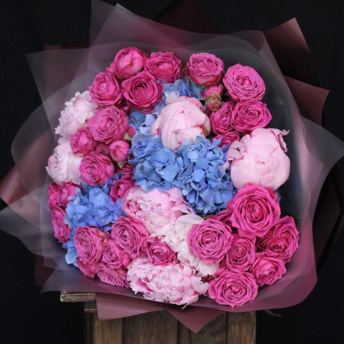 Гортензия – 2 шт.Пион Сара Бернар – 7 шт.роза кустовая пионовидная классик сенсейшн – 8 шт.Пленка дизайнерская – 5 шт.Лента атласная – 1 шт.