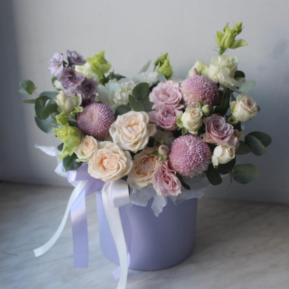 Дельфиниум – 1 шт.Эустома белая махровая – 1 шт.роза кустовая инносенсиа пинк – 1 шт.роза кустовая пионовидная софия – 1 шт.сантини байкал – 2 шт.Хризантема момоко – 3 шт.Диантус белый – 2 шт.Эвкалипт – 2 шт.Коробка шляпная – 1 шт.Тишью белое – 1 шт.Лента атласная – 2 шт.