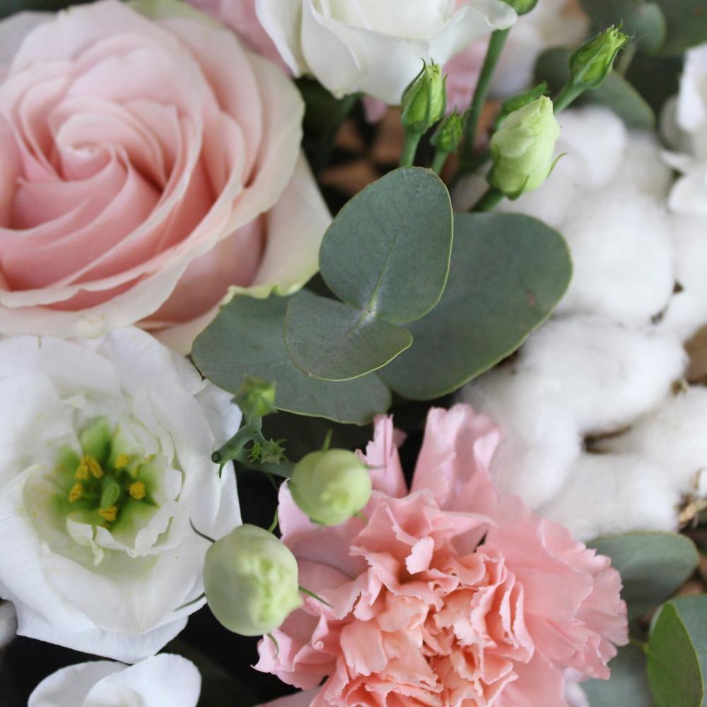 Роза Эквадор – 3 шт.Диантус – 4 шт.лизиантус розита вайт – 2 шт.Эвкалипт – 1 шт.Фисташка – 1 шт.Шляпная коробка – 1 шт.Оазис флористический – 1 шт.Диантус кустовой – 2 шт.Хлопок – 3 шт.