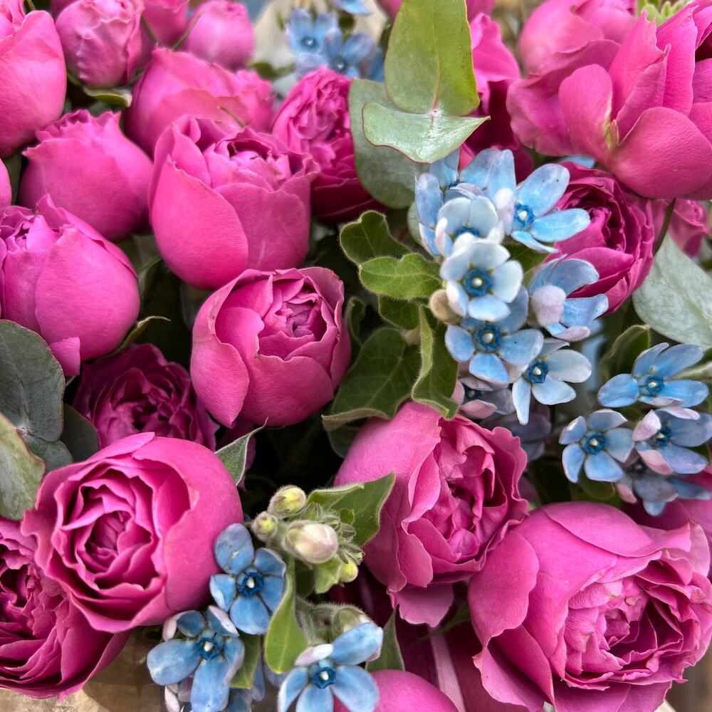 Эвкалипт – 3 шт.Лента атласная – 6 шт.Тишью – 1 шт.Коробка шляпная – 1 шт.Оксипеталум – 7 шт.Пленка матовая – 1 шт.Оазис флористический – 1 шт.роза кустовая мисти бабл – 11 шт.