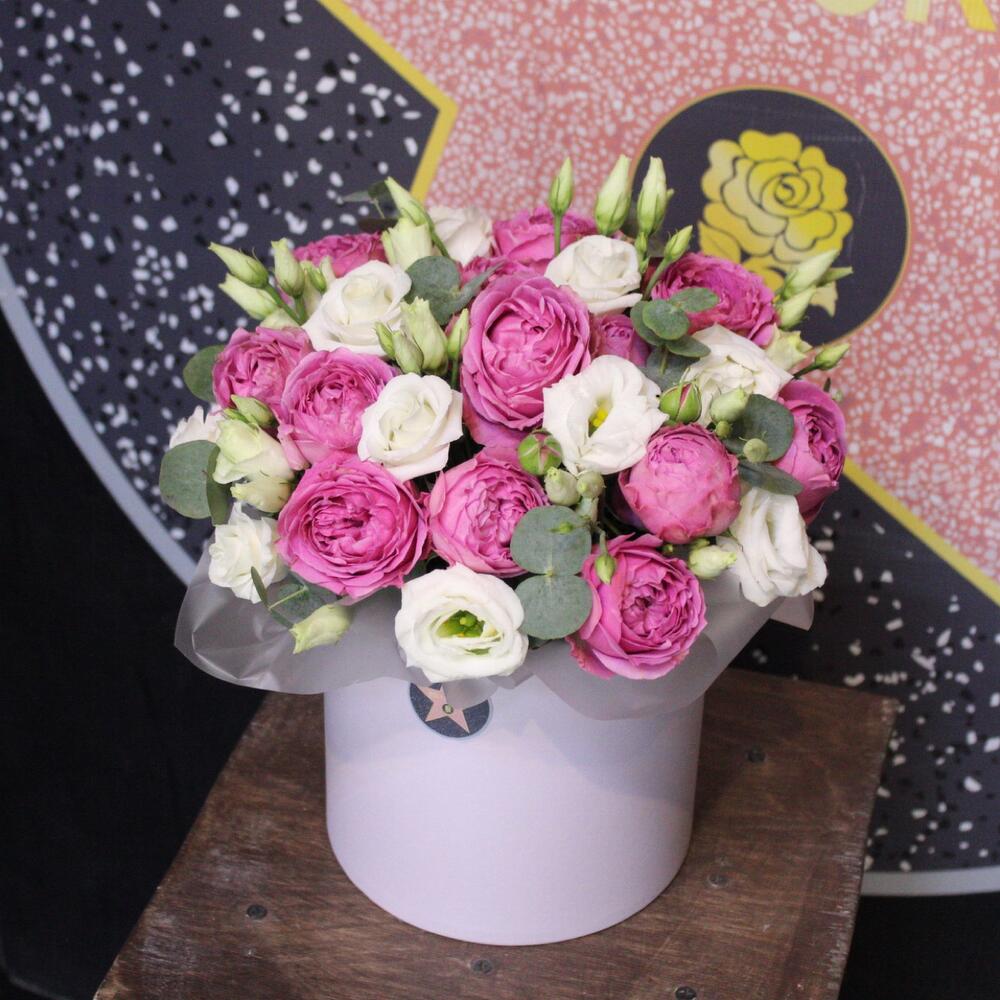 Эвкалипт – 2 шт.Шляпная коробка – 1 шт.Оазис флористический – 1 шт.эустома белая – 3 шт.Пленка дизайнерская – 1 шт.роза кустовая пионовидная misty bubbles – 4 шт.