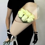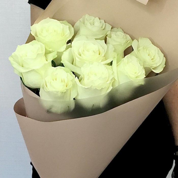 Роза белая – 9 шт. Упаковка дизайнерская – 1 шт. Открыточка с вашими пожеланиями – 1 шт. инструкция по уходу за цветами – 1 шт.