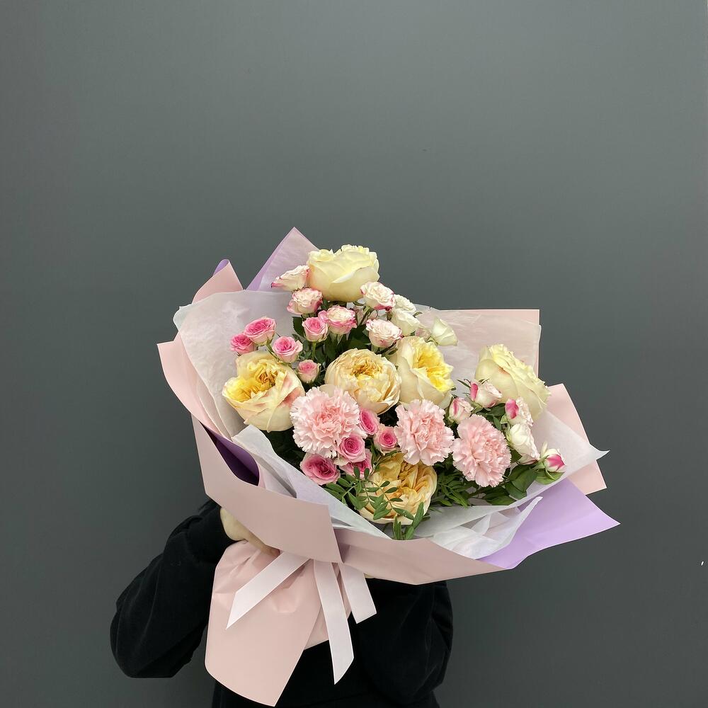 Альстромерии, Гвоздики, Кустовые розы, Лизиантусы, Розы, Хризантемы