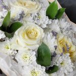 Лимониум – 1 шт.Рускус – 3 шт.Хризантема кустовая – 4 шт.Лента атласная – 1 шт.Упаковка дизайнерская – 1 шт.Роза одноголовая эквадор – 3 шт.тишью белая – 1 шт.