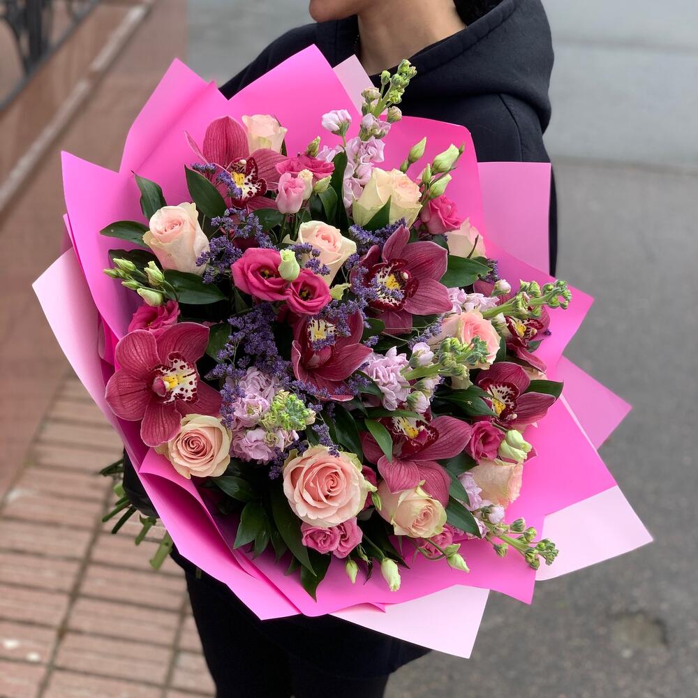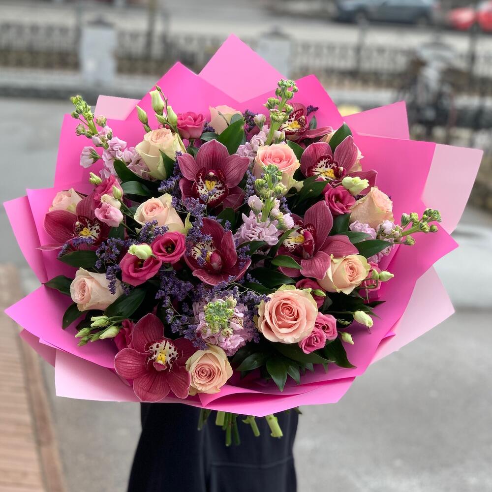 Роза – 11 шт.орхидея – 9 шт.Лизиантус – 5 шт.Маттиола – 5 шт.Лимониум – 2 шт.руссус – 5 шт.дезайнерская упаковка – 3 шт.Атласная лента – 1 шт.