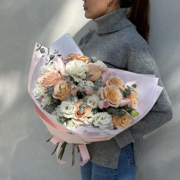 Нежный букет из лизиантусов и роз в персиковых оттенках.