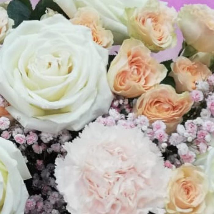 Роза кустовая – 5 шт. Эвкалипт – 3 шт. Лента атласная – 4 шт. Диантус – 3 шт. Слюда упаковка – 3 шт. салфетка декоративная – 5 шт. гипсофила радужная – 2 шт. роза плей бланка – 5 шт.