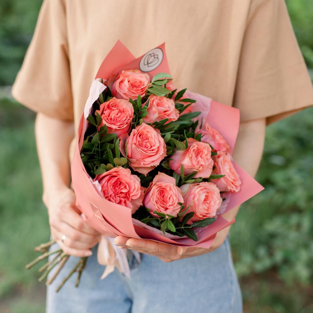 Букет из 11 кораллово-розовых пионовидных роз Wild Love с фисташкой