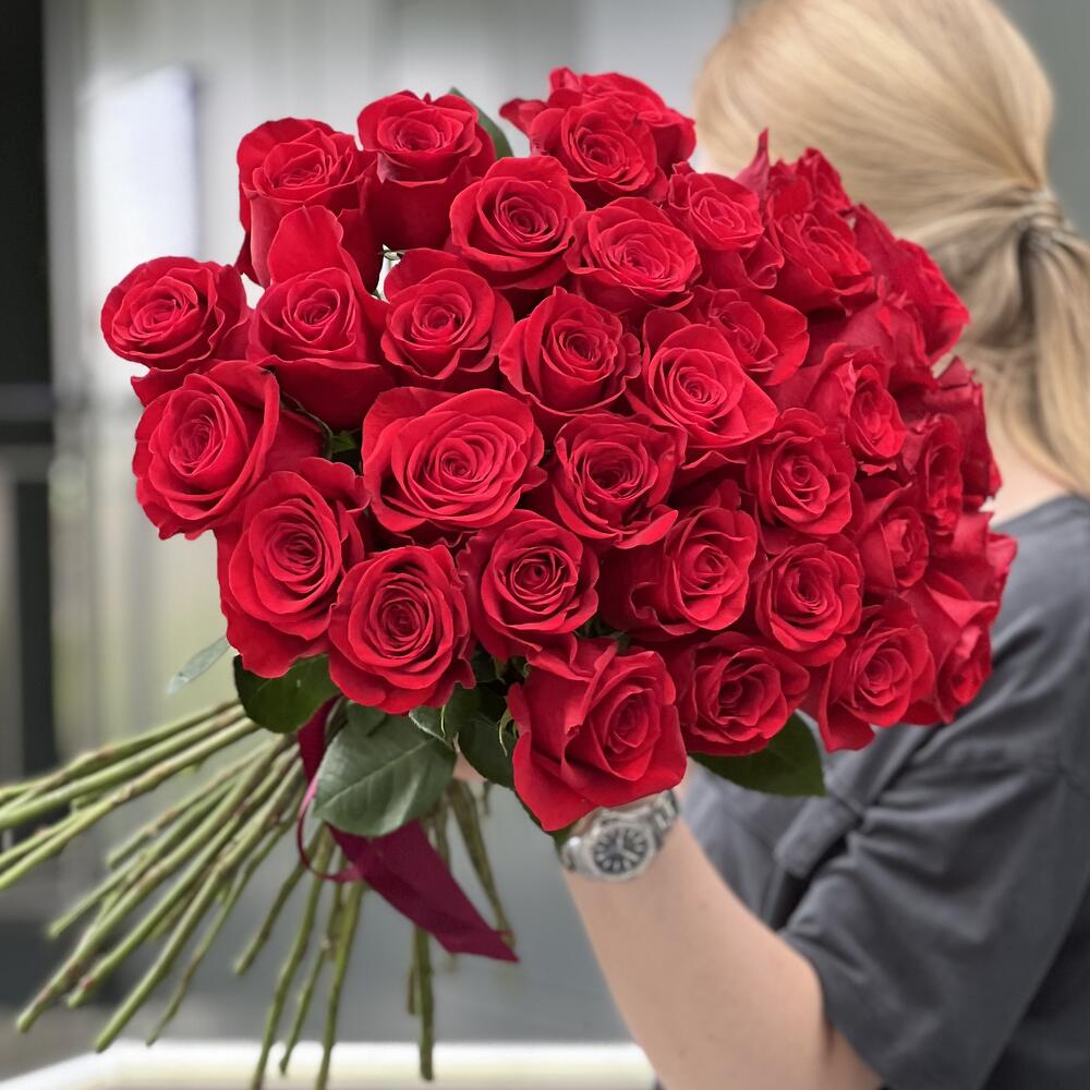 Красная роза – 35 шт. оформление – лента – 1 шт.