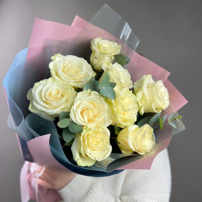 Букет из 9 белых роз с эвкалиптом