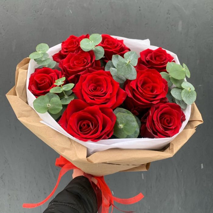 Букет из 9 красных роз с эвкалиптом