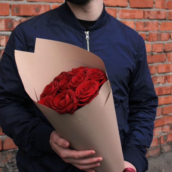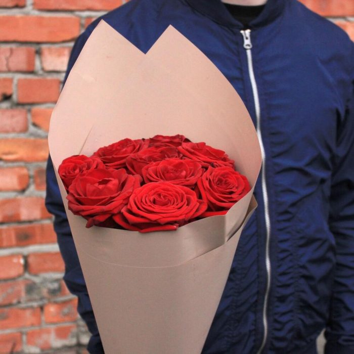 Роза красная – 9 шт.Лента атласная – 1 шт.упаковочный материал – 1 шт.