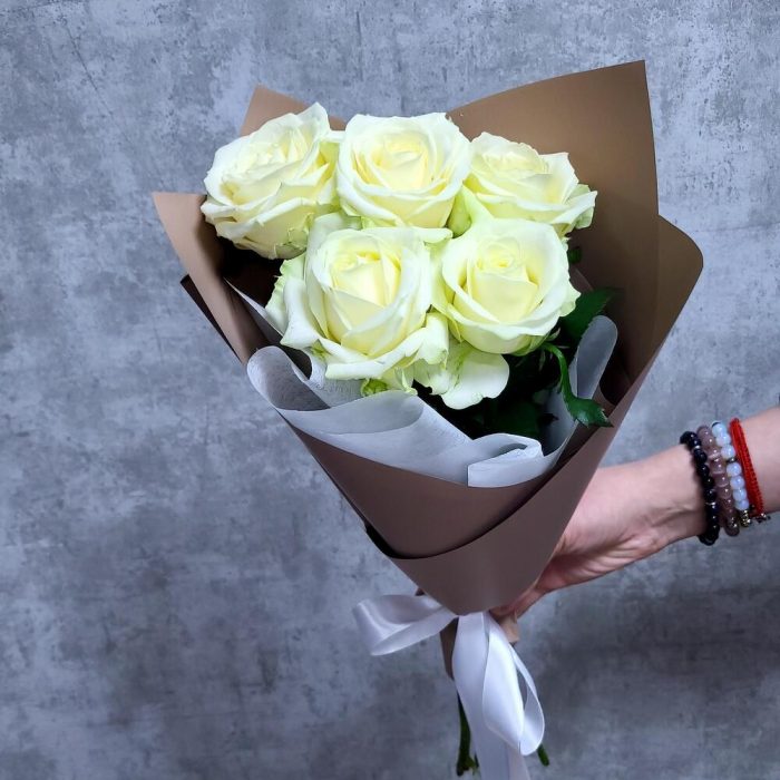 Эвкалипт – 2 шт.Лента атласная – 2 шт.Роза белая – 5 шт.Упаковка дизайнерская – 1 шт.