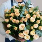 бежевые пионовидные розы – 51 шт.Лента атласная – 2 шт.Открытка – 1 шт.инструкция по уходу за цветами – 1 шт.хорошее настроение – 100 шт.коробка переноска – 1 шт.Кризал – 1 шт.Эвкалипт – 20 шт.