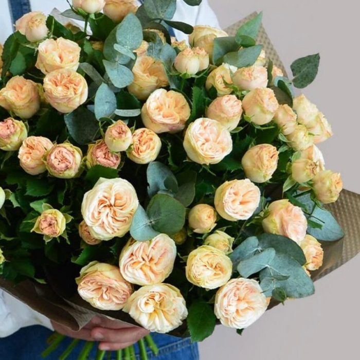 Букет из бежевых пионовидных роз и эвкалипта