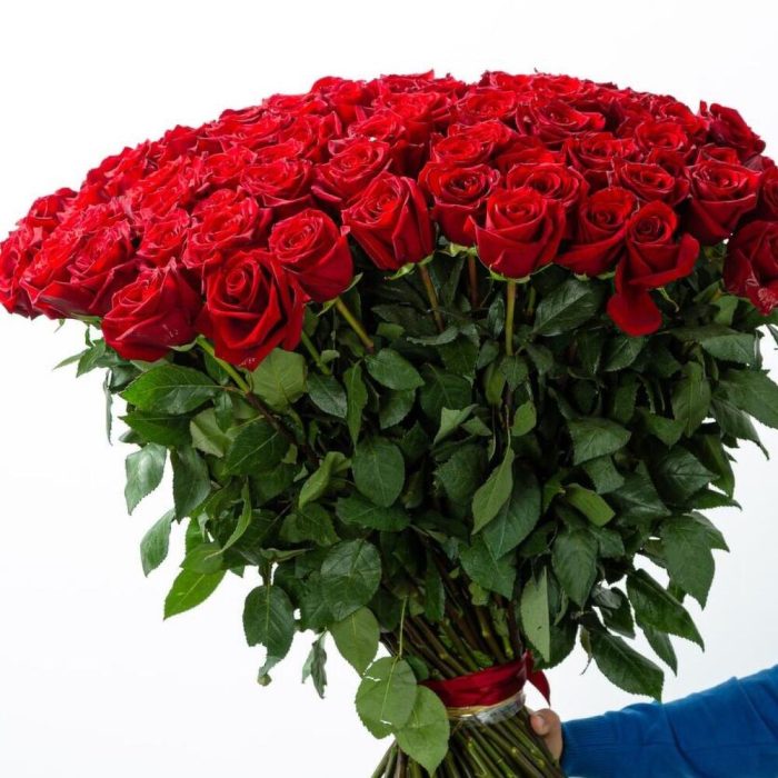 Роза голландская красная – 101 шт.Лента атласная – 2 шт.Открыточка с вашими пожеланиями – 1 шт.хорошее настроение – 100 шт.инструкция по уходу за цветами – 1 шт.коробка переноска – 1 шт.Кризал – 1 шт.