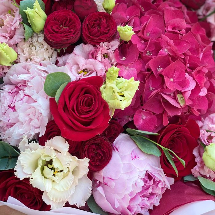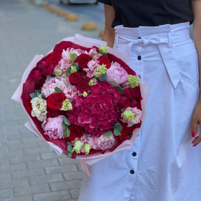 Нежный букет из георгин, пионовидных роз, гвоздик