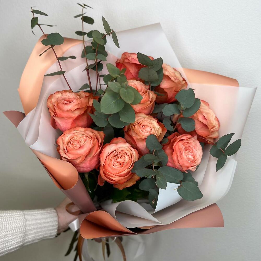 Букет из пионовидных персиковых роз и эвкалипта