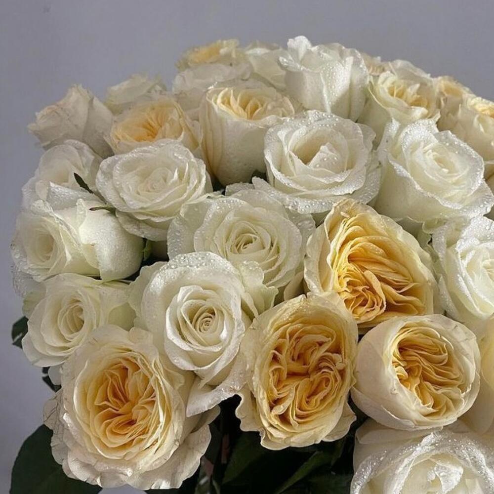 Пионовидная роза – 11 шт.Роза белая – 20 шт.Лента атласная – 2 шт.Открытка – 1 шт.инструкция по уходу за цветами – 1 шт.хорошее настроение – 100 шт.коробка переноска – 1 шт.Кризал – 1 шт.