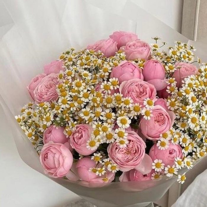 Роза пионовидная розовая – 25 шт.Ромашка кустовая – 16 шт.Упаковка дизайнерская – 1 шт.Лента атласная – 2 шт.Открыточка с вашими пожеланиями – 1 шт.хорошее настроение – 100 шт.инструкция по уходу за цветами – 1 шт.коробка переноска – 1 шт.Кризал – 1 шт.
