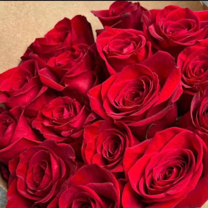 Роза красная 60 см – 15 шт.Крафт упаковка – 2 шт.Лента атласная – 2 шт.