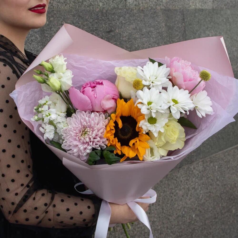 Краспедия – 2 шт.Лента – 1 шт.Маттиола – 1 шт.Хризантема кустовая – 1 шт.Роза – 2 шт.Упаковка – 4 шт.Эустома – 1 шт.Пион – 2 шт.Хризантема одноголовая – 1 шт.подсолнухи – 1 шт.