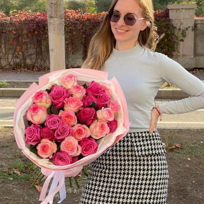 Упаковка – 1 шт. Атласная лента – 1 шт. розовая микс роза – 25 шт.
