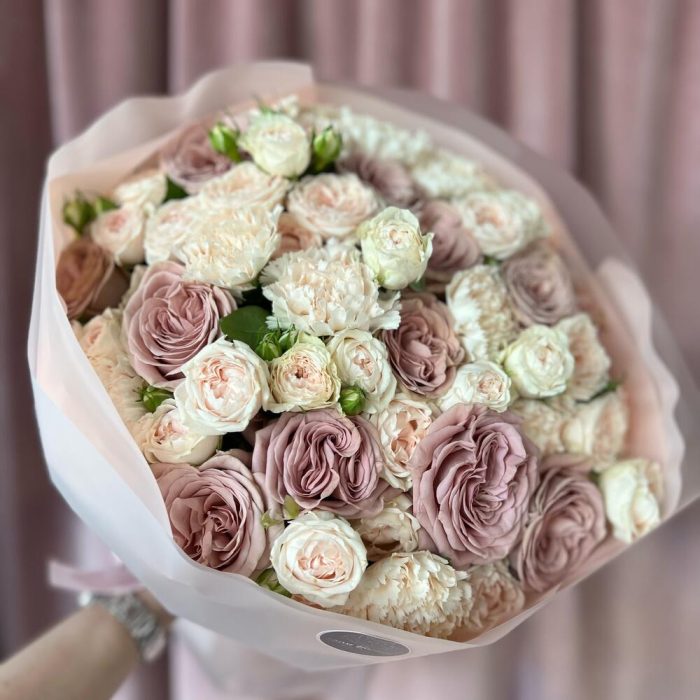 Пионовидная роза – 12 шт.Кустовая роза – 7 шт.Диантус – 9 шт.декоративная упаковка – 1 шт.Атласная лента – 1 шт.