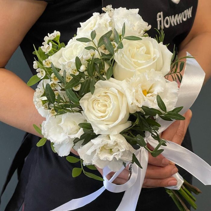 Ваксфлауэр – 1 шт.Лента – 1 шт.Лизиантус – 2 шт.Роза одноголовая – 5 шт.Фисташка – 1 шт.